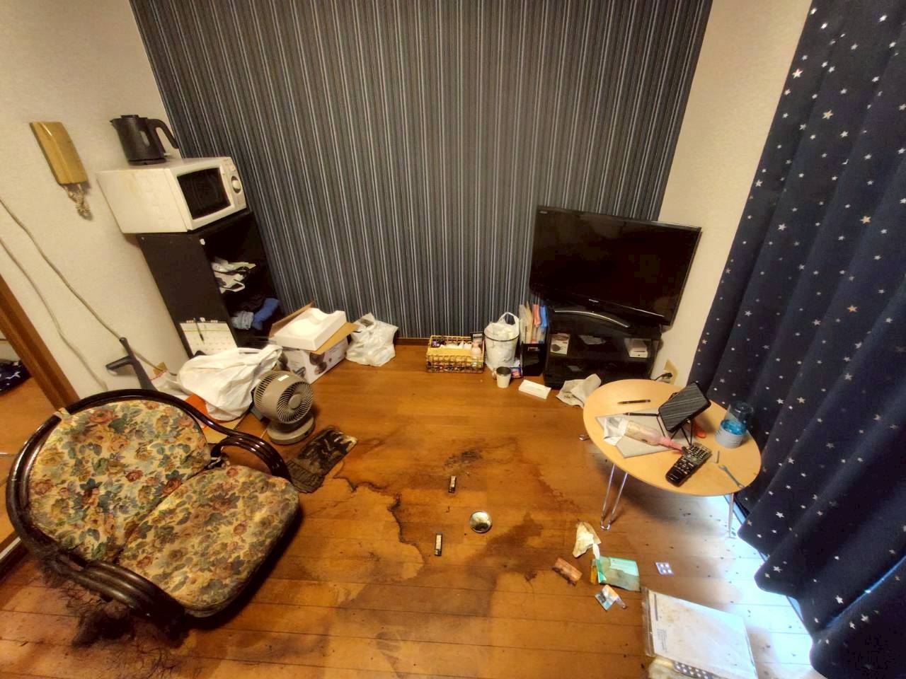室内には強い臭いが残り、床下まで体液が浸透していました。